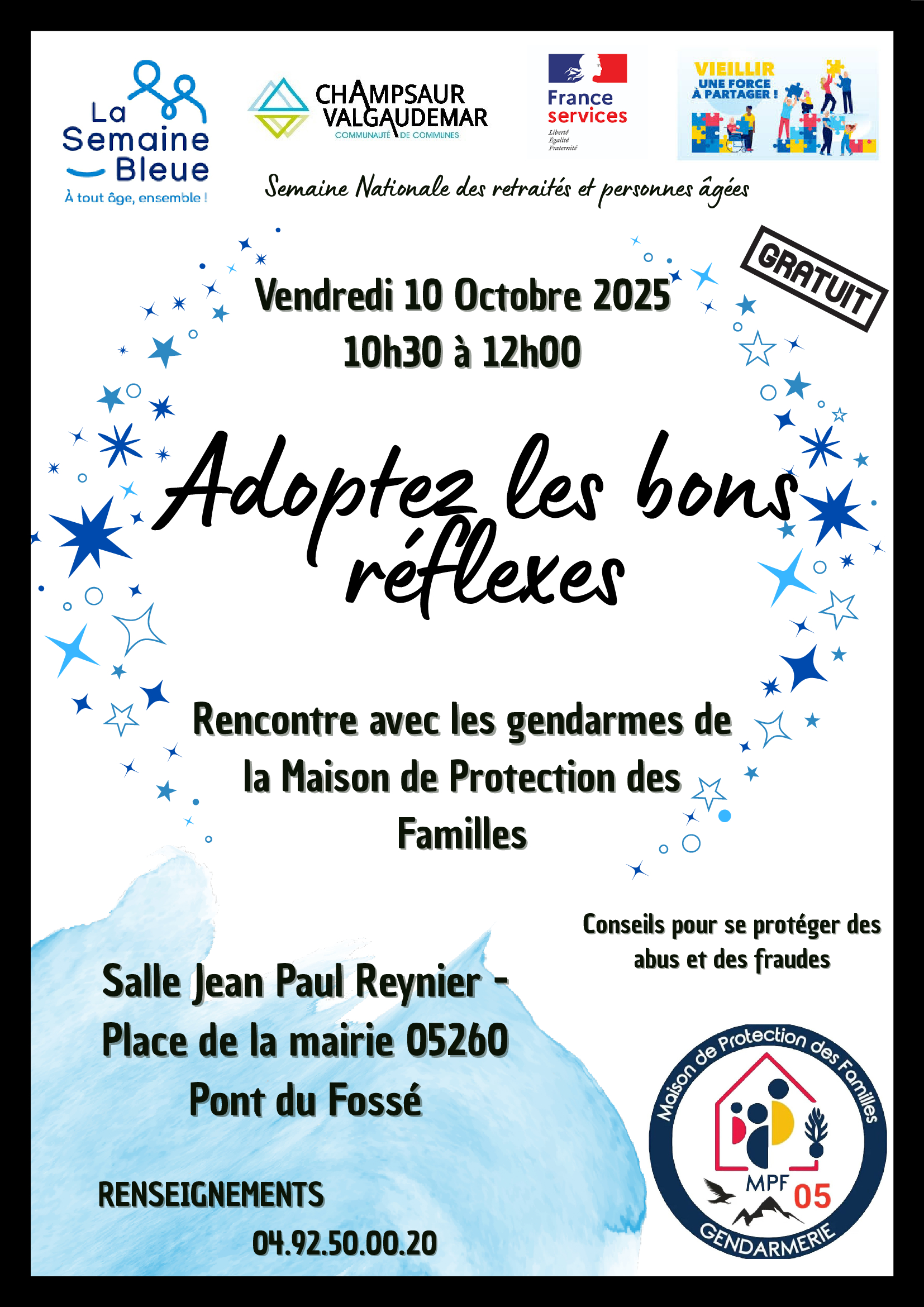 Dans le cadre de la semaine bleue, les gendarmes de la Maison de Protection des Familles viennent à votre rencontre pour une présentation sur le thème "les conseils pour se protéger des abus et des fraudes" à la maison, dans la rue et sur internet.